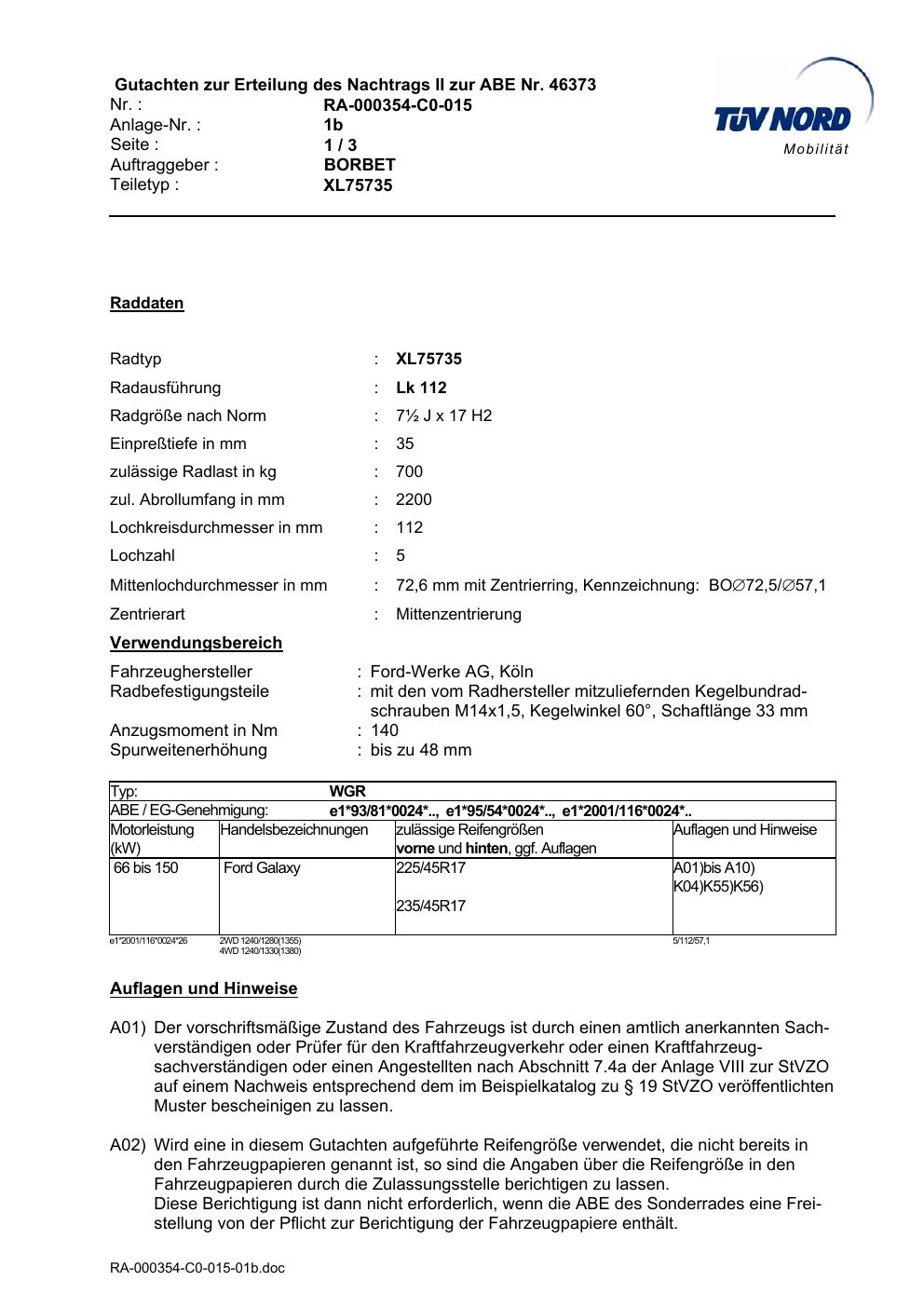 Dieses Gutachten (abe) bezieht sich auf die Alufelge Borbet XL75735 in der Ausführung ET 0, Mittenloch 0 mm (KBA 46373). Im PDF findest du typischerweise zulässige Reifengrößen, Auflagen/Anbauhinweise und – je nach Dokument – Hinweise zur Eintragung.