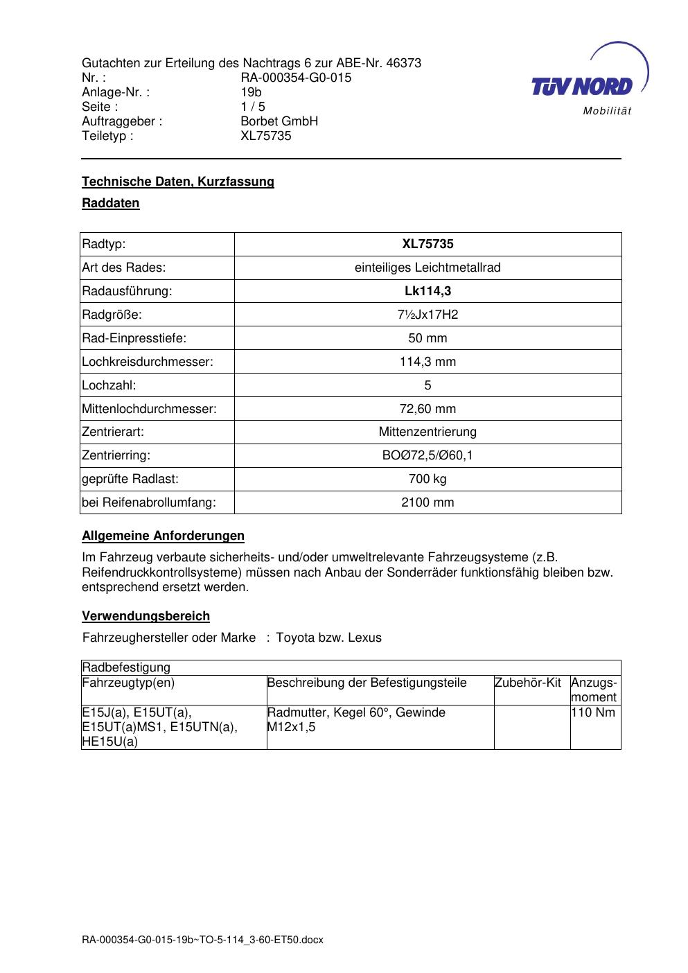 Dieses Gutachten (abe) bezieht sich auf die Alufelge brand-borbet XL75735 in der Ausführung ET 0, Mittenloch 0 mm (KBA 46373). Im PDF findest du typischerweise zulässige Reifengrößen, Auflagen/Anbauhinweise und – je nach Dokument – Hinweise zur Eintragung.