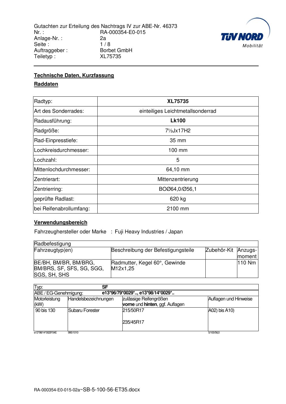 Dieses Gutachten (abe) bezieht sich auf die Alufelge brand-borbet XL75735 in der Ausführung ET 0, Mittenloch 0 mm (KBA 46373). Im PDF findest du typischerweise zulässige Reifengrößen, Auflagen/Anbauhinweise und – je nach Dokument – Hinweise zur Eintragung.