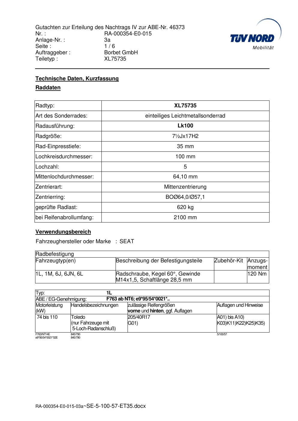 Dieses Gutachten (abe) bezieht sich auf die Alufelge brand-borbet XL75735 in der Ausführung ET 0, Mittenloch 0 mm (KBA 46373). Im PDF findest du typischerweise zulässige Reifengrößen, Auflagen/Anbauhinweise und – je nach Dokument – Hinweise zur Eintragung.