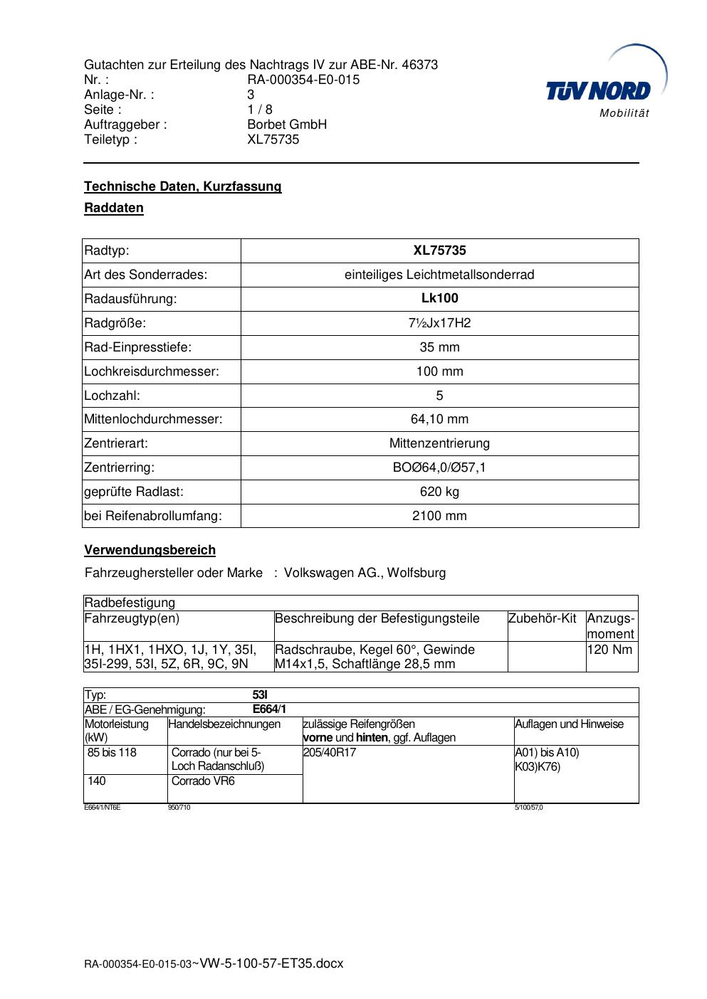 Dieses Gutachten (abe) bezieht sich auf die Alufelge brand-borbet XL75735 in der Ausführung ET 0, Mittenloch 0 mm (KBA 46373). Im PDF findest du typischerweise zulässige Reifengrößen, Auflagen/Anbauhinweise und – je nach Dokument – Hinweise zur Eintragung.