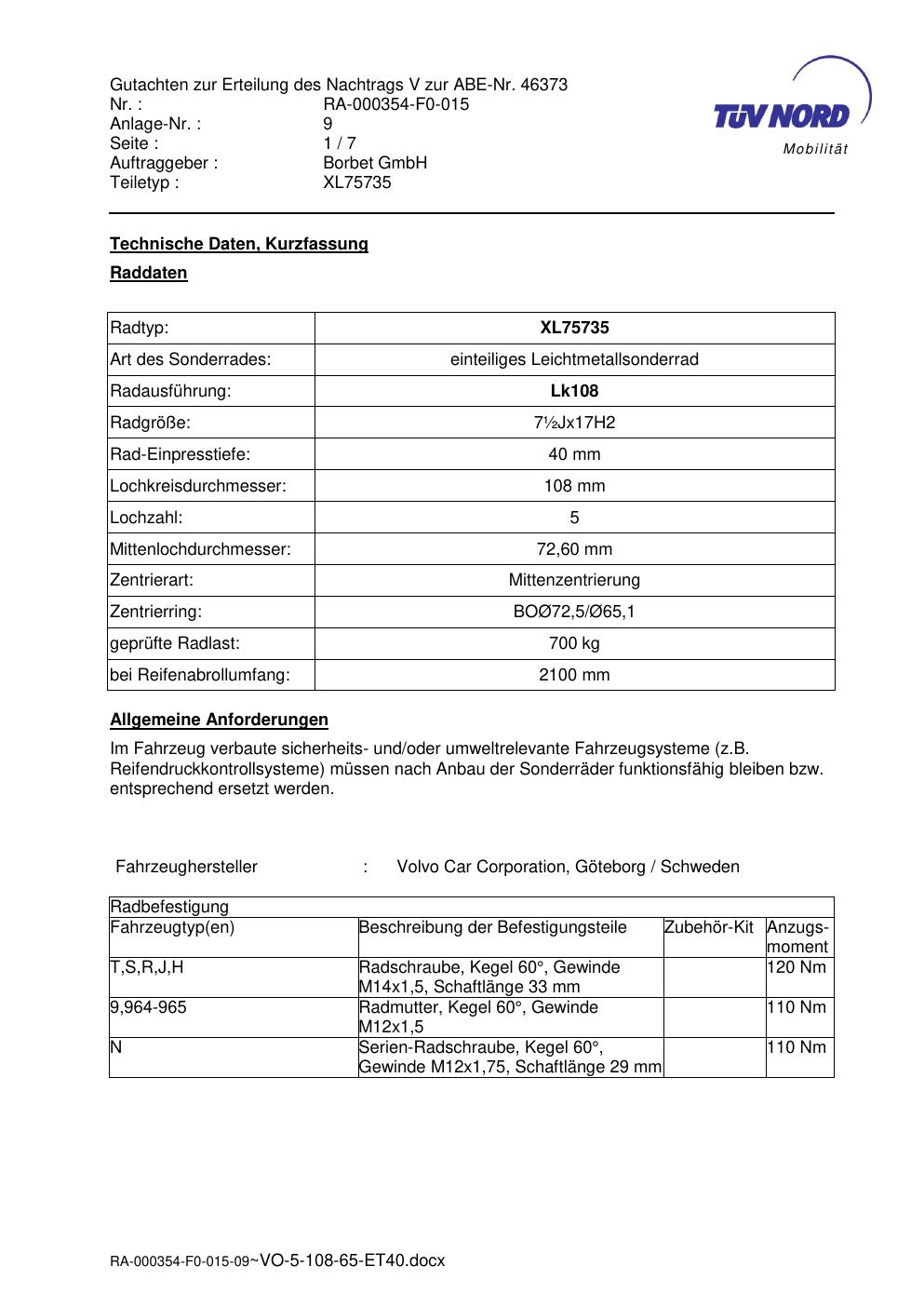 Dieses Gutachten (abe) bezieht sich auf die Alufelge brand-borbet XL75735 in der Ausführung ET 0, Mittenloch 0 mm (KBA 46373). Im PDF findest du typischerweise zulässige Reifengrößen, Auflagen/Anbauhinweise und – je nach Dokument – Hinweise zur Eintragung.