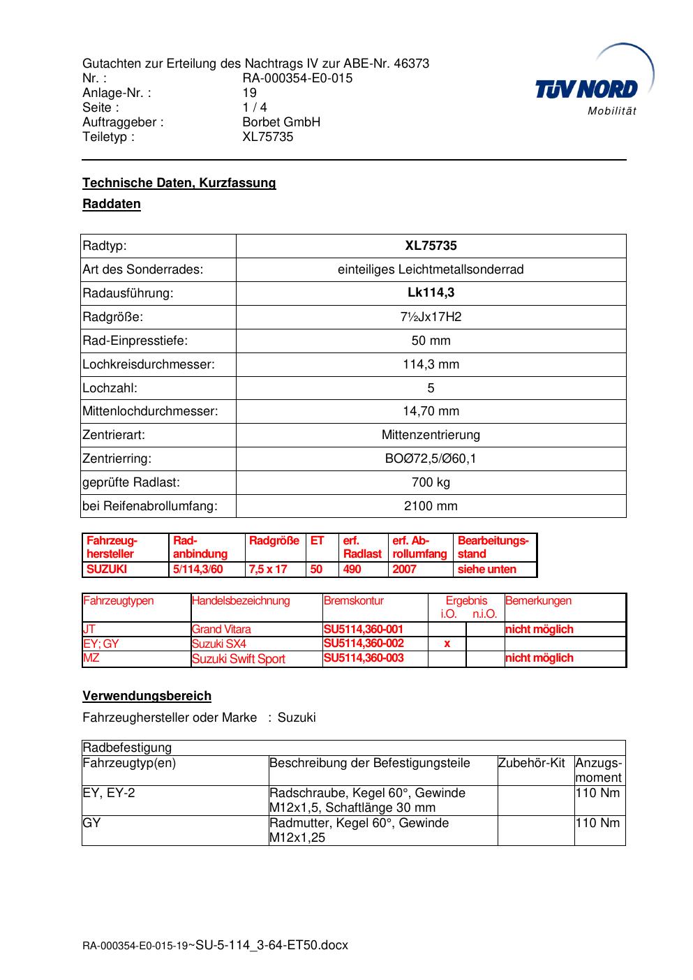 Dieses Gutachten (abe) bezieht sich auf die Alufelge brand-borbet XL75735 in der Ausführung 7.5Jx17 ET 0, Mittenloch 0 mm (KBA 46373). Im PDF findest du typischerweise zulässige Reifengrößen, Auflagen/Anbauhinweise und – je nach Dokument – Hinweise zur Eintragung.
