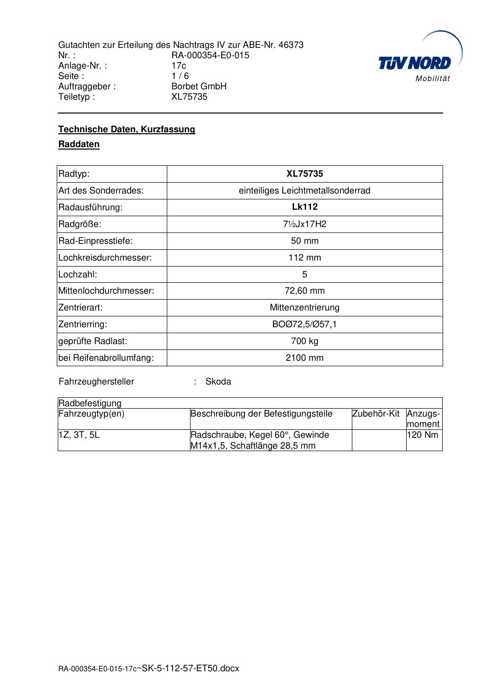 Dieses Gutachten (abe) bezieht sich auf die Alufelge brand-borbet XL75735 in der Ausführung ET 0, Mittenloch 0 mm (KBA 46373). Im PDF findest du typischerweise zulässige Reifengrößen, Auflagen/Anbauhinweise und – je nach Dokument – Hinweise zur Eintragung.