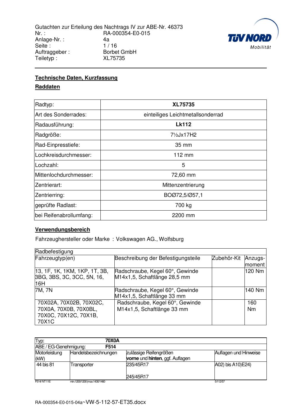 Dieses Gutachten (abe) bezieht sich auf die Alufelge brand-borbet XL75735 in der Ausführung ET 0, Mittenloch 0 mm (KBA 46373). Im PDF findest du typischerweise zulässige Reifengrößen, Auflagen/Anbauhinweise und – je nach Dokument – Hinweise zur Eintragung.
