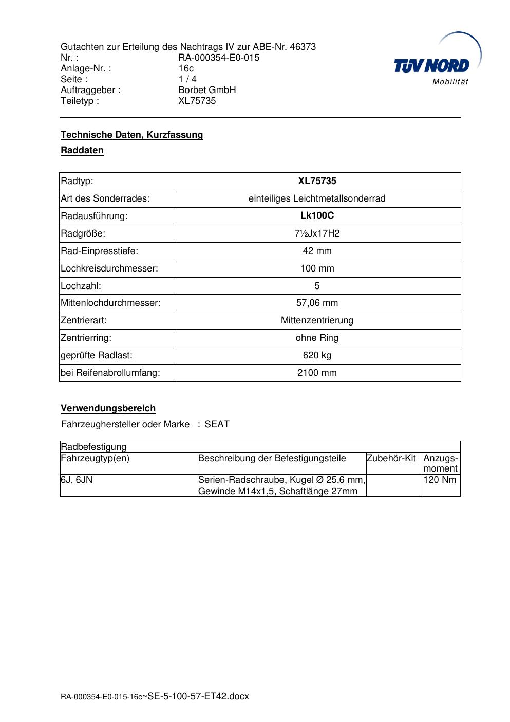 Dieses Gutachten (abe) bezieht sich auf die Alufelge brand-borbet XL75735 in der Ausführung ET 0, Mittenloch 0 mm (KBA 46373). Im PDF findest du typischerweise zulässige Reifengrößen, Auflagen/Anbauhinweise und – je nach Dokument – Hinweise zur Eintragung.