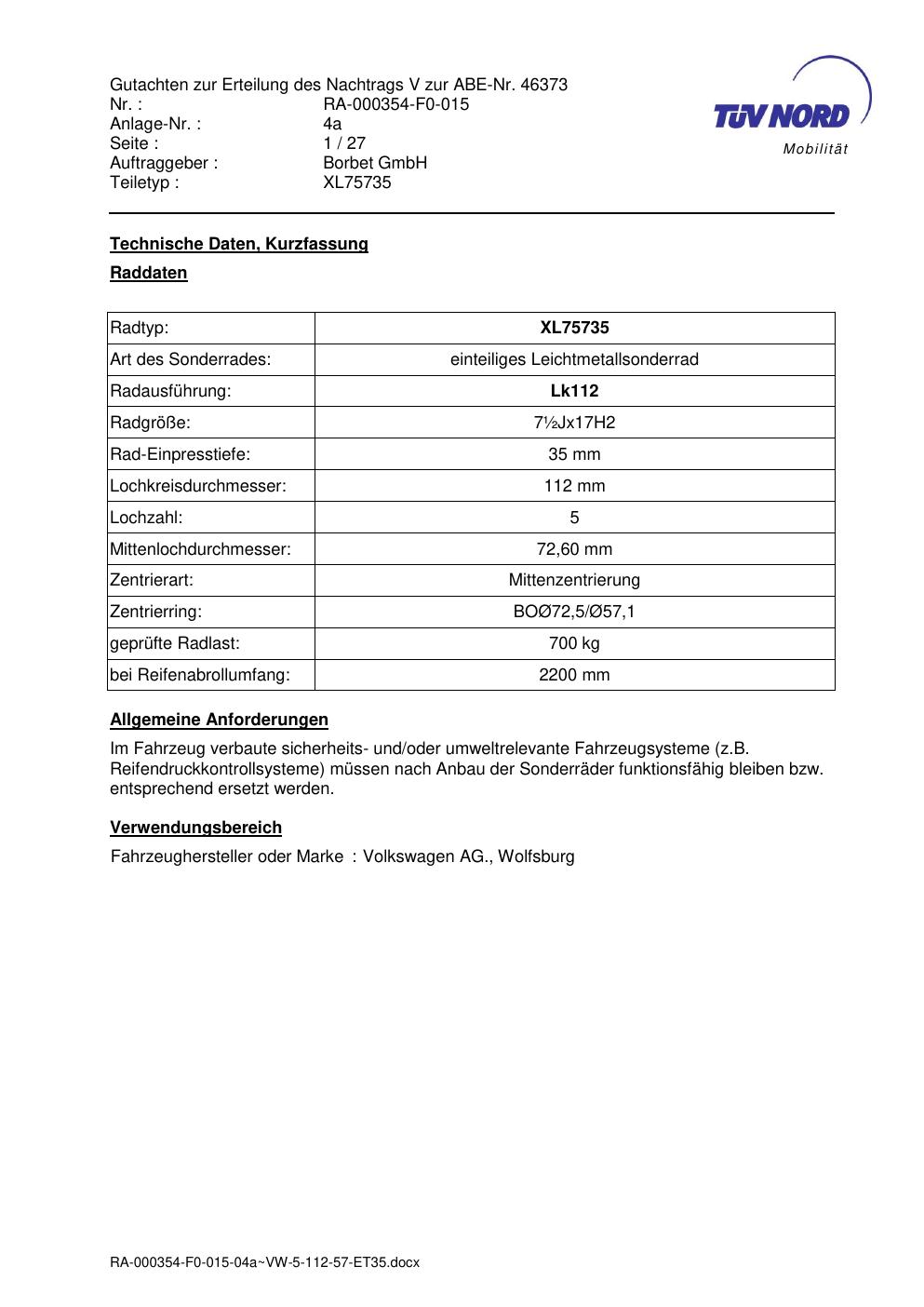 Dieses Gutachten (abe) bezieht sich auf die Alufelge Borbet XL75735 in der Ausführung ET 0, Mittenloch 0 mm (KBA 46373). Im PDF findest du typischerweise zulässige Reifengrößen, Auflagen/Anbauhinweise und – je nach Dokument – Hinweise zur Eintragung.
