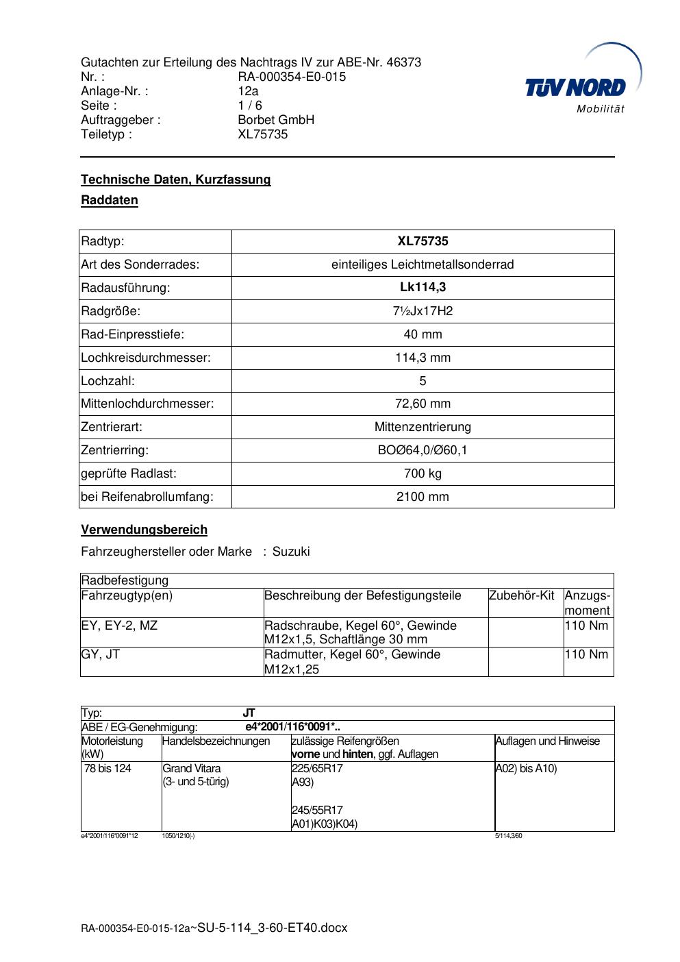 Dieses Gutachten (abe) bezieht sich auf die Alufelge brand-borbet XL75735 in der Ausführung ET 0, Mittenloch 0 mm (KBA 46373). Im PDF findest du typischerweise zulässige Reifengrößen, Auflagen/Anbauhinweise und – je nach Dokument – Hinweise zur Eintragung.