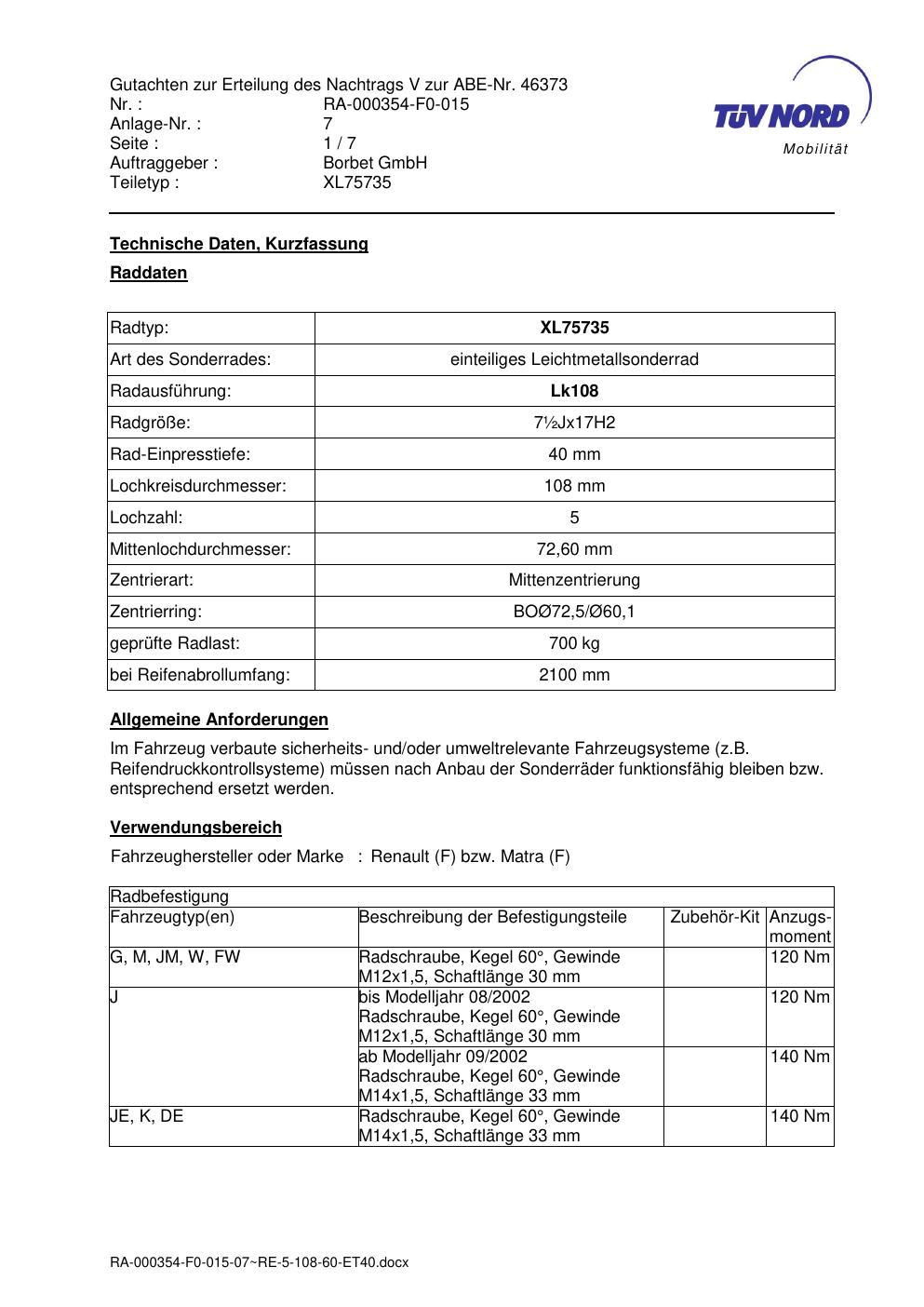 Dieses Gutachten (abe) bezieht sich auf die Alufelge brand-borbet XL75735 in der Ausführung ET 0, Mittenloch 0 mm (KBA 46373). Im PDF findest du typischerweise zulässige Reifengrößen, Auflagen/Anbauhinweise und – je nach Dokument – Hinweise zur Eintragung.