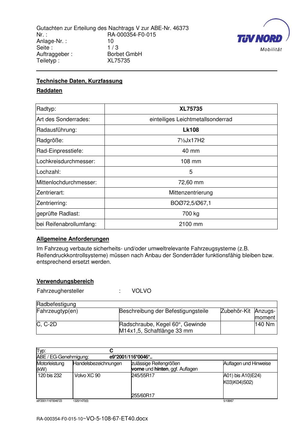 Dieses Gutachten (abe) bezieht sich auf die Alufelge brand-borbet XL75735 in der Ausführung ET 0, Mittenloch 0 mm (KBA 46373). Im PDF findest du typischerweise zulässige Reifengrößen, Auflagen/Anbauhinweise und – je nach Dokument – Hinweise zur Eintragung.