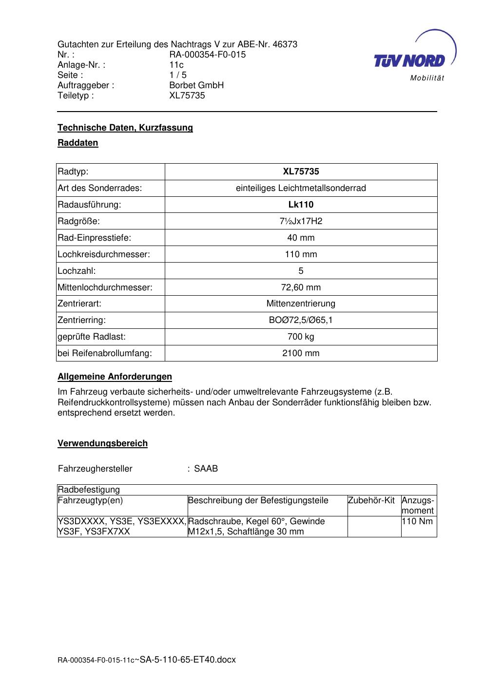Dieses Gutachten (abe) bezieht sich auf die Alufelge brand-borbet XL75735 in der Ausführung ET 0, Mittenloch 0 mm (KBA 46373). Im PDF findest du typischerweise zulässige Reifengrößen, Auflagen/Anbauhinweise und – je nach Dokument – Hinweise zur Eintragung.
