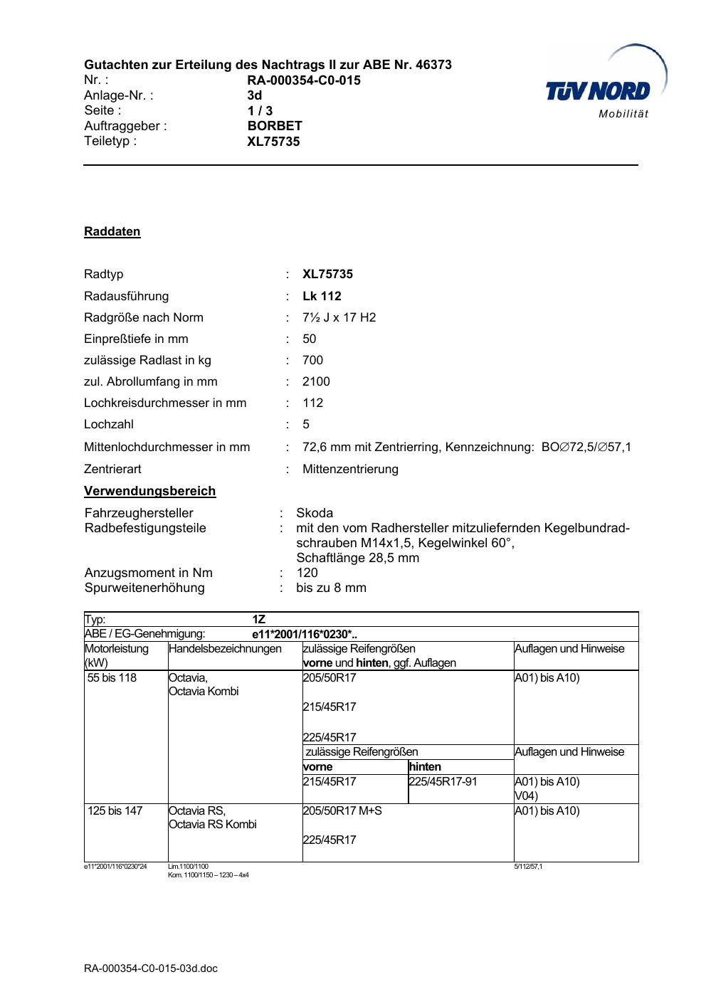 Dieses Gutachten (abe) bezieht sich auf die Alufelge Borbet XL75735 in der Ausführung ET 0, Mittenloch 0 mm (KBA 46373). Im PDF findest du typischerweise zulässige Reifengrößen, Auflagen/Anbauhinweise und – je nach Dokument – Hinweise zur Eintragung.