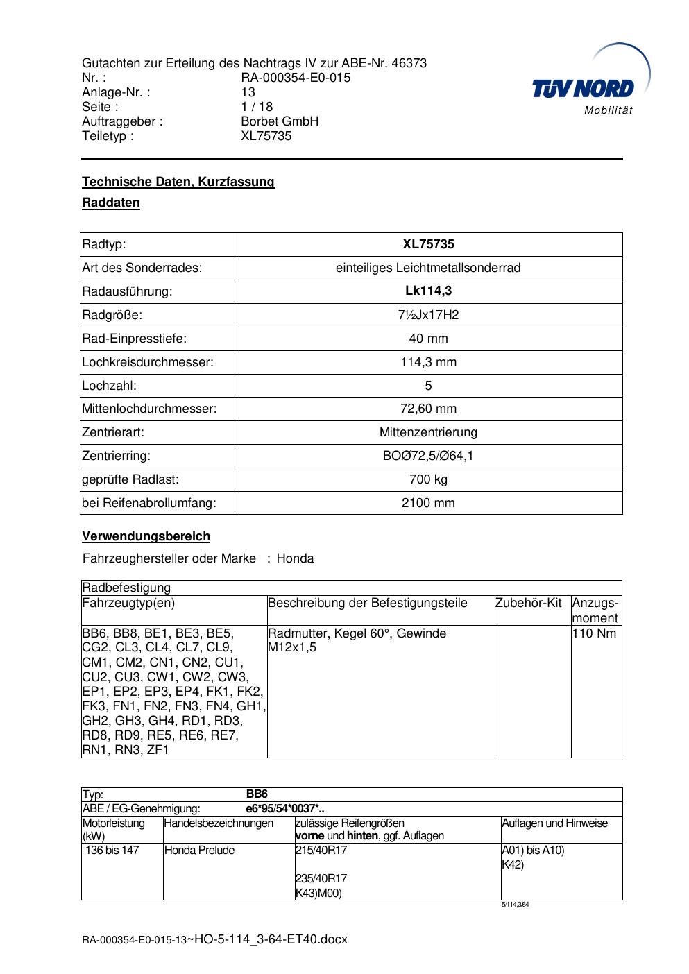 Dieses Gutachten (abe) bezieht sich auf die Alufelge brand-borbet XL75735 in der Ausführung ET 0, Mittenloch 0 mm (KBA 46373). Im PDF findest du typischerweise zulässige Reifengrößen, Auflagen/Anbauhinweise und – je nach Dokument – Hinweise zur Eintragung.