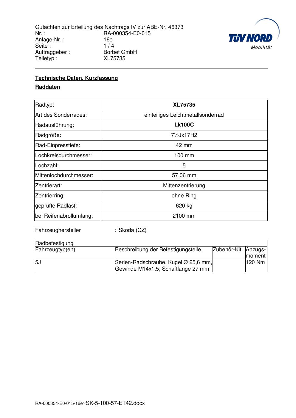 Dieses Gutachten (abe) bezieht sich auf die Alufelge brand-borbet XL75735 in der Ausführung ET 0, Mittenloch 0 mm (KBA 46373). Im PDF findest du typischerweise zulässige Reifengrößen, Auflagen/Anbauhinweise und – je nach Dokument – Hinweise zur Eintragung.