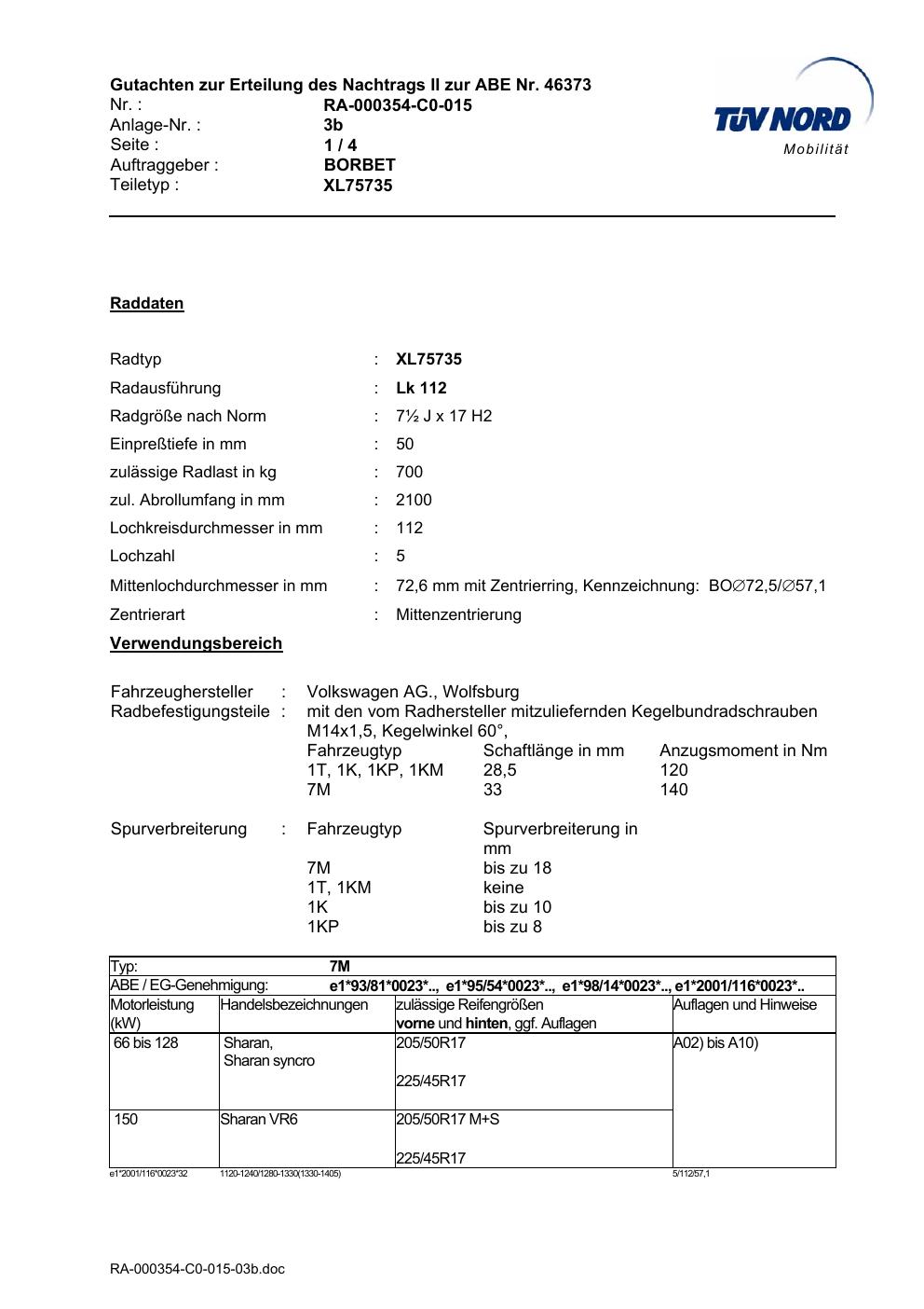 Dieses Gutachten (abe) bezieht sich auf die Alufelge Borbet XL75735 in der Ausführung ET 0, Mittenloch 0 mm (KBA 46373). Im PDF findest du typischerweise zulässige Reifengrößen, Auflagen/Anbauhinweise und – je nach Dokument – Hinweise zur Eintragung.