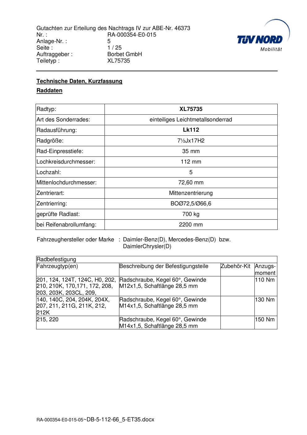 Dieses Gutachten (abe) bezieht sich auf die Alufelge brand-borbet XL75735 in der Ausführung ET 0, Mittenloch 0 mm (KBA 46373). Im PDF findest du typischerweise zulässige Reifengrößen, Auflagen/Anbauhinweise und – je nach Dokument – Hinweise zur Eintragung.