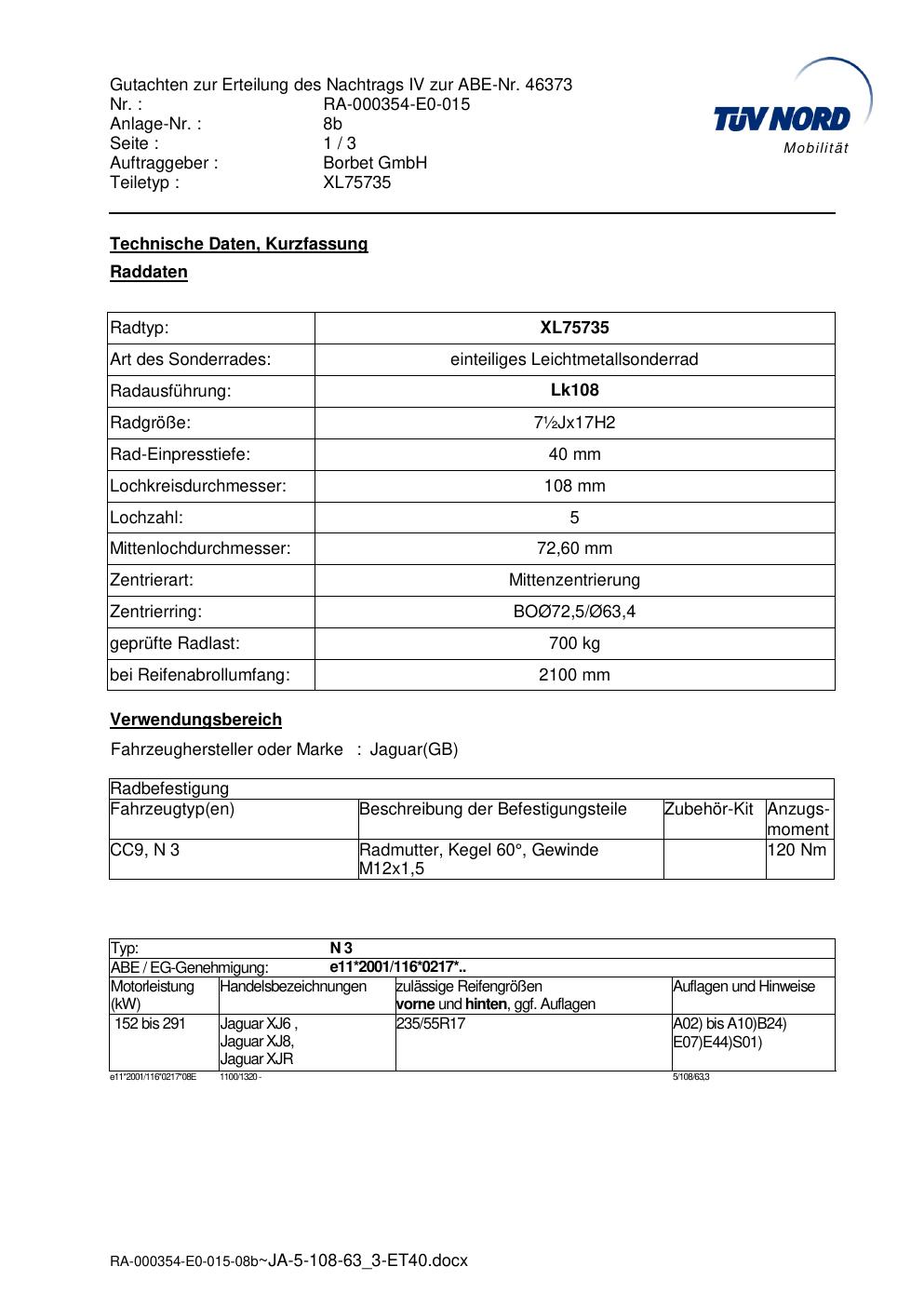 Dieses Gutachten (abe) bezieht sich auf die Alufelge brand-borbet XL75735 in der Ausführung ET 0, Mittenloch 0 mm (KBA 46373). Im PDF findest du typischerweise zulässige Reifengrößen, Auflagen/Anbauhinweise und – je nach Dokument – Hinweise zur Eintragung.