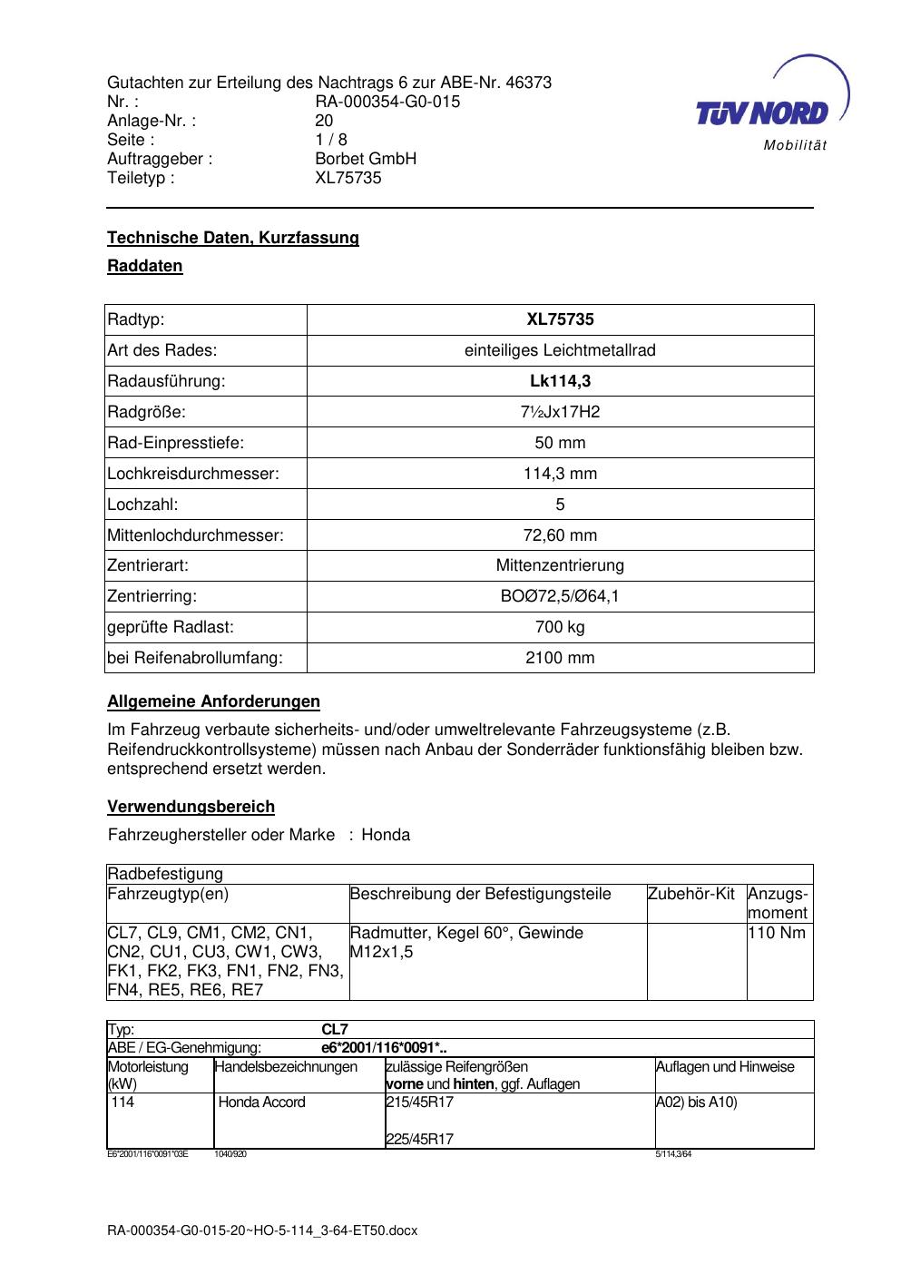 Dieses Gutachten (abe) bezieht sich auf die Alufelge brand-borbet XL75735 in der Ausführung ET 0, Mittenloch 0 mm (KBA 46373). Im PDF findest du typischerweise zulässige Reifengrößen, Auflagen/Anbauhinweise und – je nach Dokument – Hinweise zur Eintragung.
