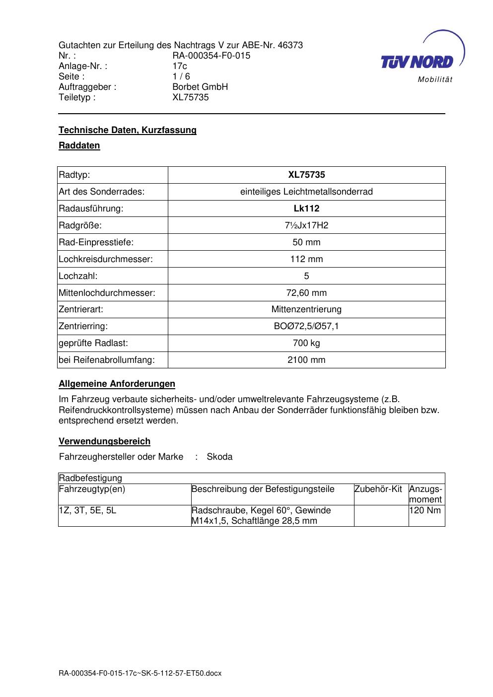 Dieses Gutachten (abe) bezieht sich auf die Alufelge brand-borbet XL75735 in der Ausführung ET 0, Mittenloch 0 mm (KBA 46373). Im PDF findest du typischerweise zulässige Reifengrößen, Auflagen/Anbauhinweise und – je nach Dokument – Hinweise zur Eintragung.