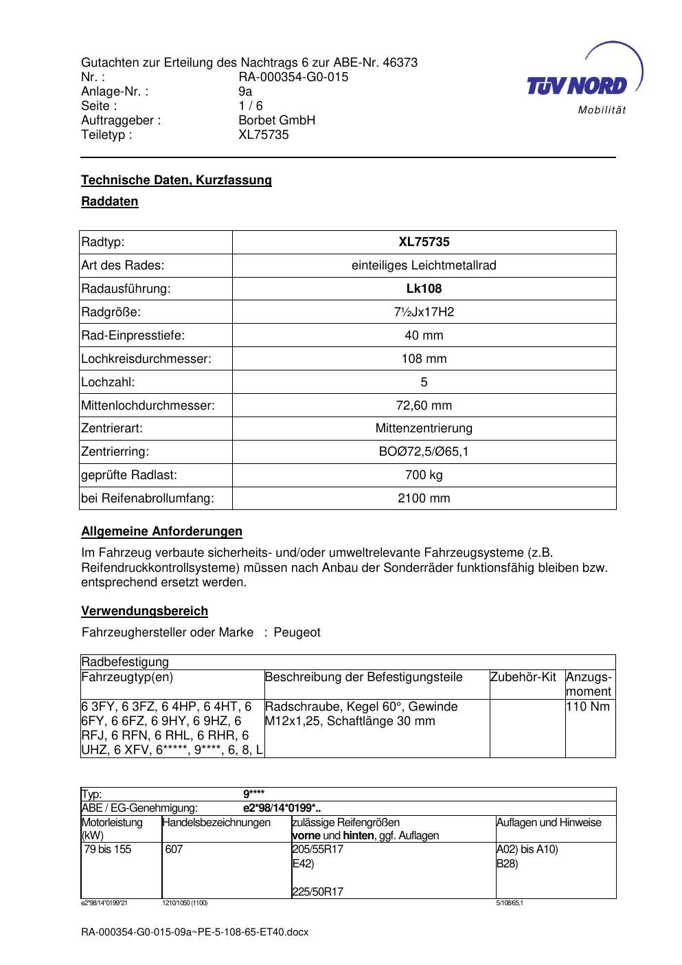 Dieses Gutachten (abe) bezieht sich auf die Alufelge brand-borbet XL75735 in der Ausführung ET 0, Mittenloch 0 mm (KBA 46373). Im PDF findest du typischerweise zulässige Reifengrößen, Auflagen/Anbauhinweise und – je nach Dokument – Hinweise zur Eintragung.