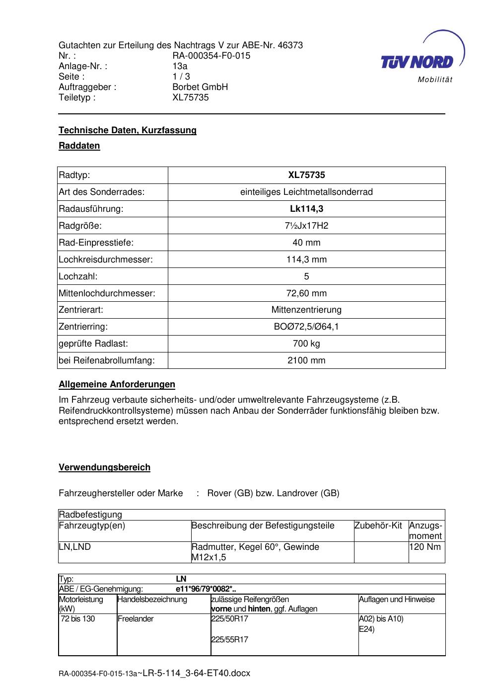 Dieses Gutachten (abe) bezieht sich auf die Alufelge Borbet XL75735 in der Ausführung ET 0, Mittenloch 0 mm (KBA 46373). Im PDF findest du typischerweise zulässige Reifengrößen, Auflagen/Anbauhinweise und – je nach Dokument – Hinweise zur Eintragung.