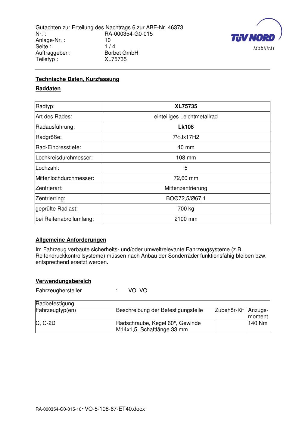 Dieses Gutachten (abe) bezieht sich auf die Alufelge brand-borbet XL75735 in der Ausführung ET 0, Mittenloch 0 mm (KBA 46373). Im PDF findest du typischerweise zulässige Reifengrößen, Auflagen/Anbauhinweise und – je nach Dokument – Hinweise zur Eintragung.