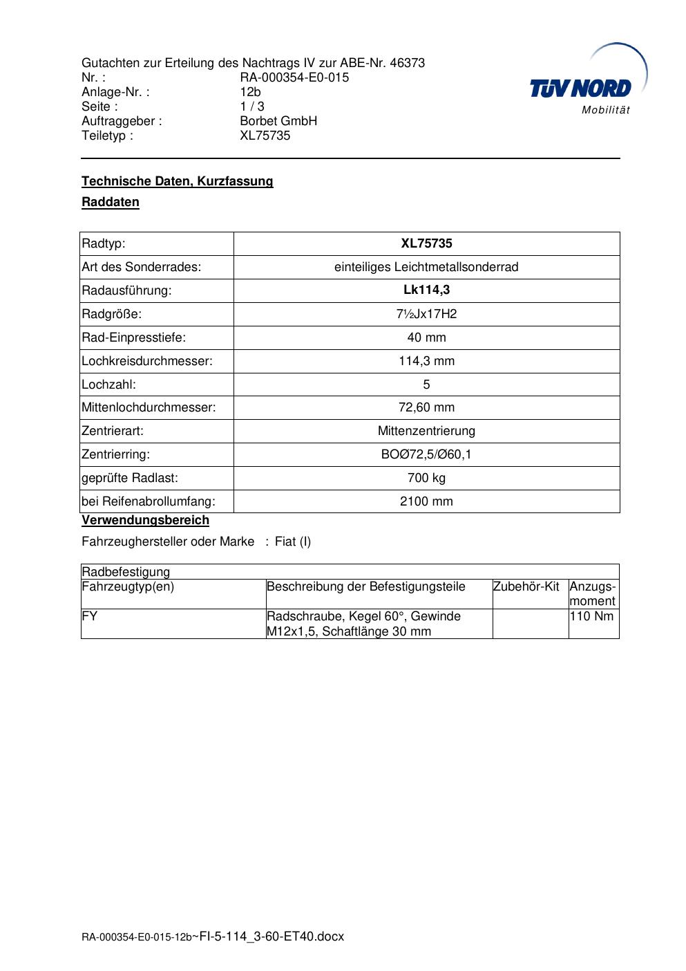 Dieses Gutachten (abe) bezieht sich auf die Alufelge brand-borbet XL75735 in der Ausführung ET 0, Mittenloch 0 mm (KBA 46373). Im PDF findest du typischerweise zulässige Reifengrößen, Auflagen/Anbauhinweise und – je nach Dokument – Hinweise zur Eintragung.
