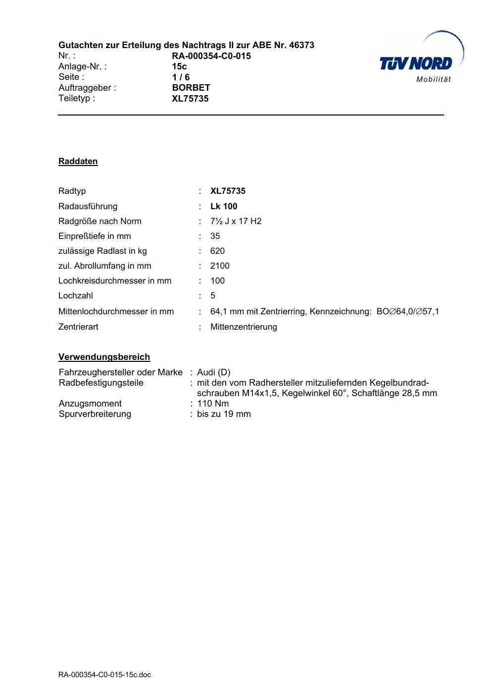Dieses Gutachten (abe) bezieht sich auf die Alufelge Borbet XL75735 in der Ausführung ET 0, Mittenloch 0 mm (KBA 46373). Im PDF findest du typischerweise zulässige Reifengrößen, Auflagen/Anbauhinweise und – je nach Dokument – Hinweise zur Eintragung.