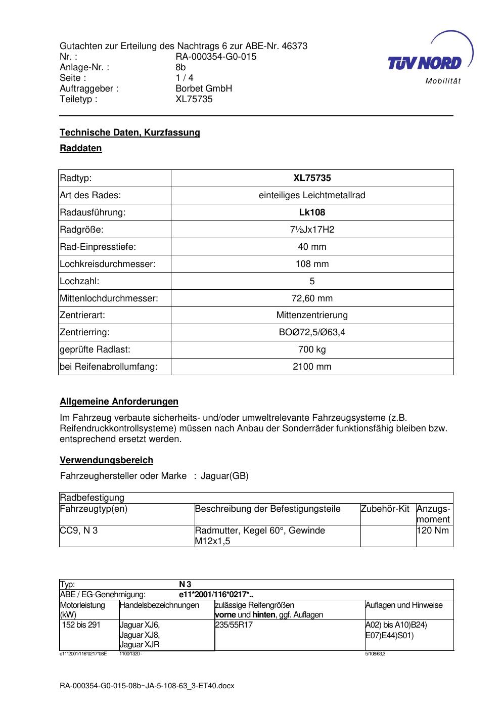 Dieses Gutachten (abe) bezieht sich auf die Alufelge brand-borbet XL75735 in der Ausführung ET 0, Mittenloch 0 mm (KBA 46373). Im PDF findest du typischerweise zulässige Reifengrößen, Auflagen/Anbauhinweise und – je nach Dokument – Hinweise zur Eintragung.