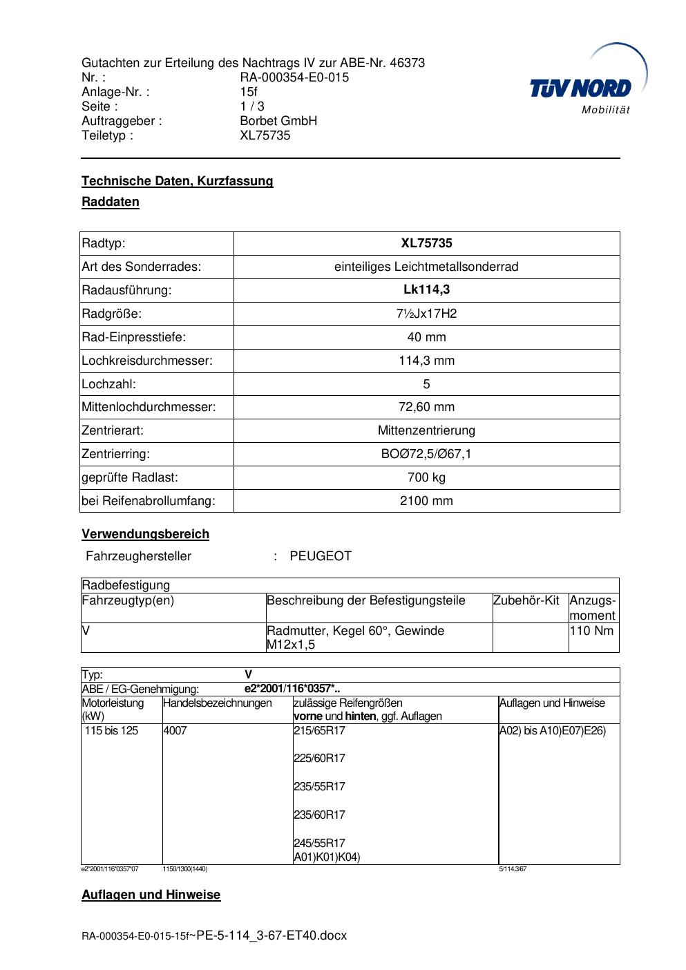 Dieses Gutachten (abe) bezieht sich auf die Alufelge brand-borbet XL75735 in der Ausführung ET 0, Mittenloch 0 mm (KBA 46373). Im PDF findest du typischerweise zulässige Reifengrößen, Auflagen/Anbauhinweise und – je nach Dokument – Hinweise zur Eintragung.