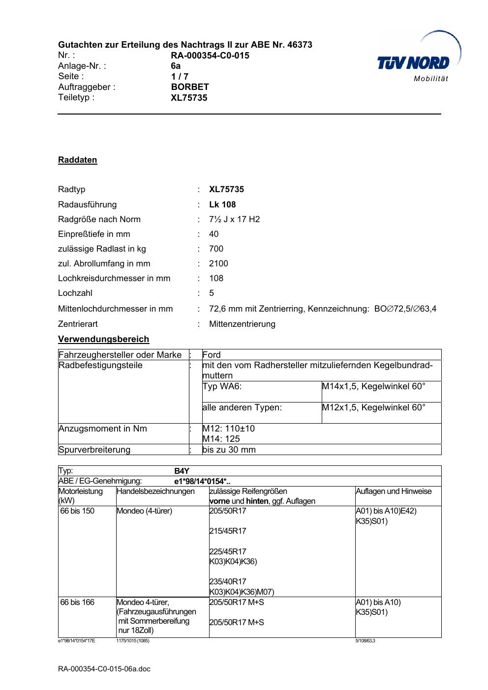 Dieses Gutachten (abe) bezieht sich auf die Alufelge Borbet XL75735 in der Ausführung ET 0, Mittenloch 0 mm (KBA 46373). Im PDF findest du typischerweise zulässige Reifengrößen, Auflagen/Anbauhinweise und – je nach Dokument – Hinweise zur Eintragung.