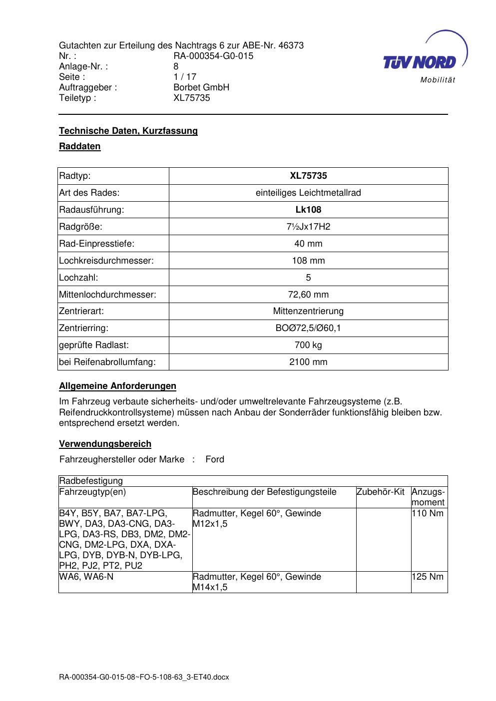 Dieses Gutachten (abe) bezieht sich auf die Alufelge brand-borbet XL75735 in der Ausführung ET 0, Mittenloch 0 mm (KBA 46373). Im PDF findest du typischerweise zulässige Reifengrößen, Auflagen/Anbauhinweise und – je nach Dokument – Hinweise zur Eintragung.
