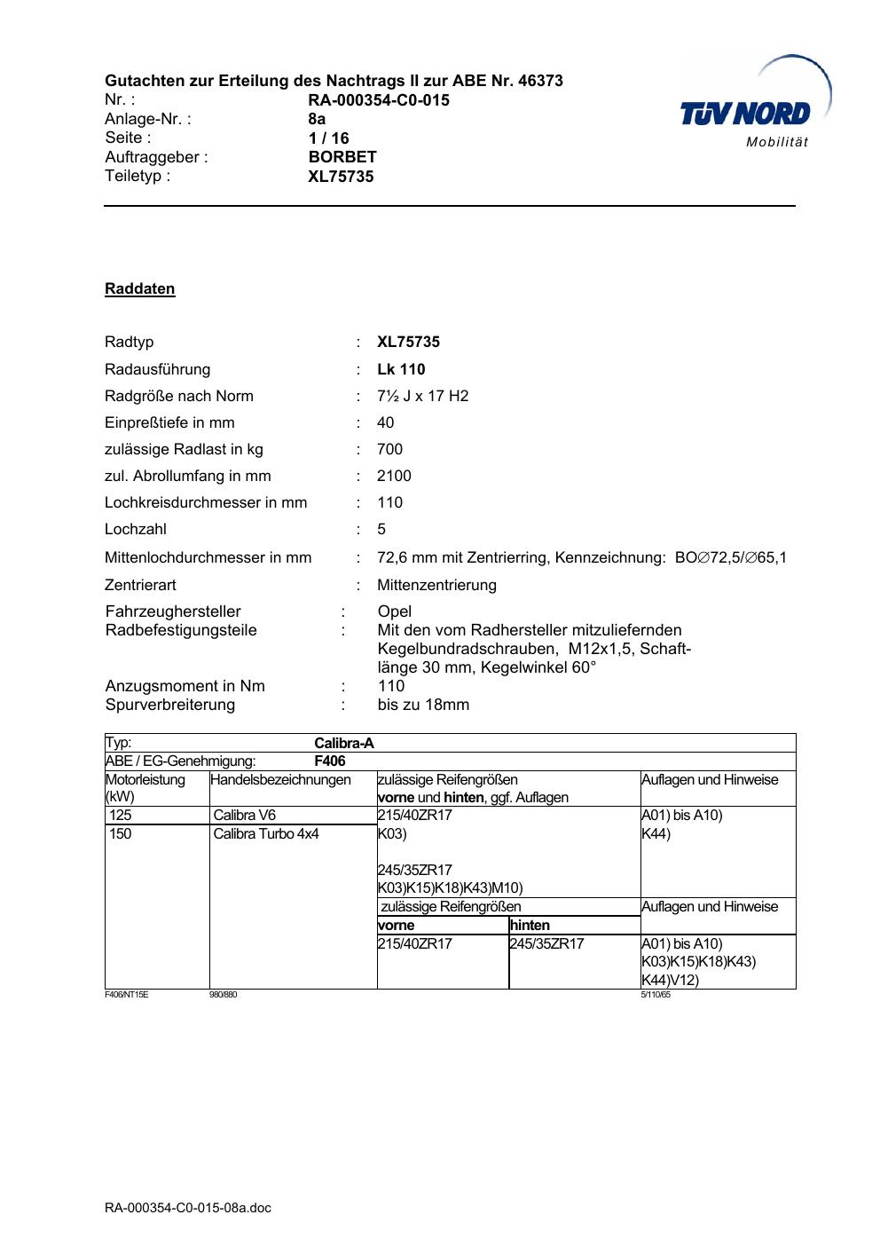 Dieses Gutachten (abe) bezieht sich auf die Alufelge Borbet XL75735 in der Ausführung ET 0, Mittenloch 0 mm (KBA 46373). Im PDF findest du typischerweise zulässige Reifengrößen, Auflagen/Anbauhinweise und – je nach Dokument – Hinweise zur Eintragung.