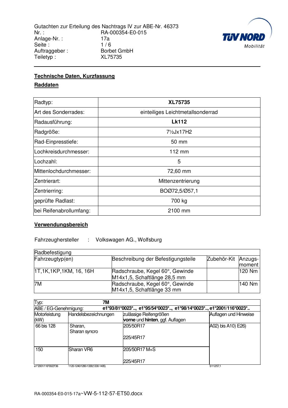 Dieses Gutachten (abe) bezieht sich auf die Alufelge brand-borbet XL75735 in der Ausführung ET 0, Mittenloch 0 mm (KBA 46373). Im PDF findest du typischerweise zulässige Reifengrößen, Auflagen/Anbauhinweise und – je nach Dokument – Hinweise zur Eintragung.