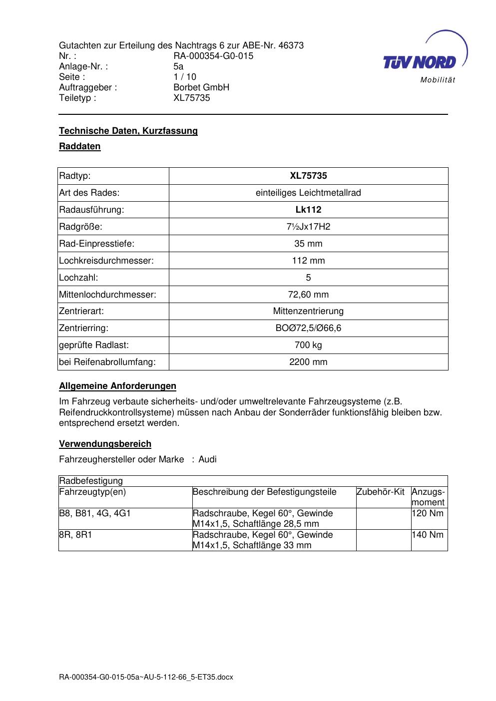 Dieses Gutachten (abe) bezieht sich auf die Alufelge brand-borbet XL75735 in der Ausführung ET 0, Mittenloch 0 mm (KBA 46373). Im PDF findest du typischerweise zulässige Reifengrößen, Auflagen/Anbauhinweise und – je nach Dokument – Hinweise zur Eintragung.