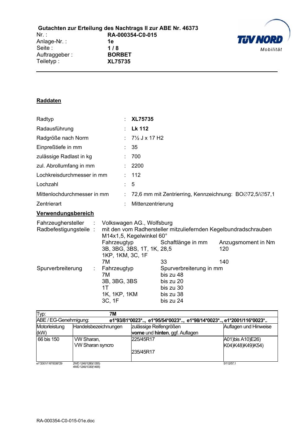 Dieses Gutachten (abe) bezieht sich auf die Alufelge Borbet XL75735 in der Ausführung ET 0, Mittenloch 0 mm (KBA 46373). Im PDF findest du typischerweise zulässige Reifengrößen, Auflagen/Anbauhinweise und – je nach Dokument – Hinweise zur Eintragung.