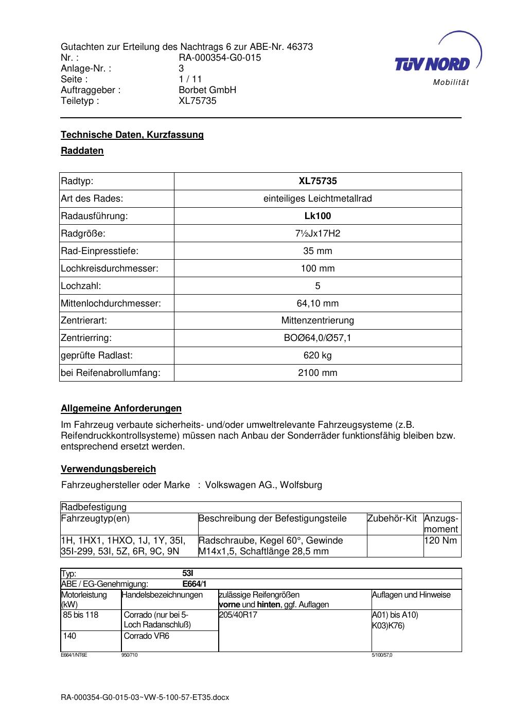 Dieses Gutachten (abe) bezieht sich auf die Alufelge brand-borbet XL75735 in der Ausführung ET 0, Mittenloch 0 mm (KBA 46373). Im PDF findest du typischerweise zulässige Reifengrößen, Auflagen/Anbauhinweise und – je nach Dokument – Hinweise zur Eintragung.