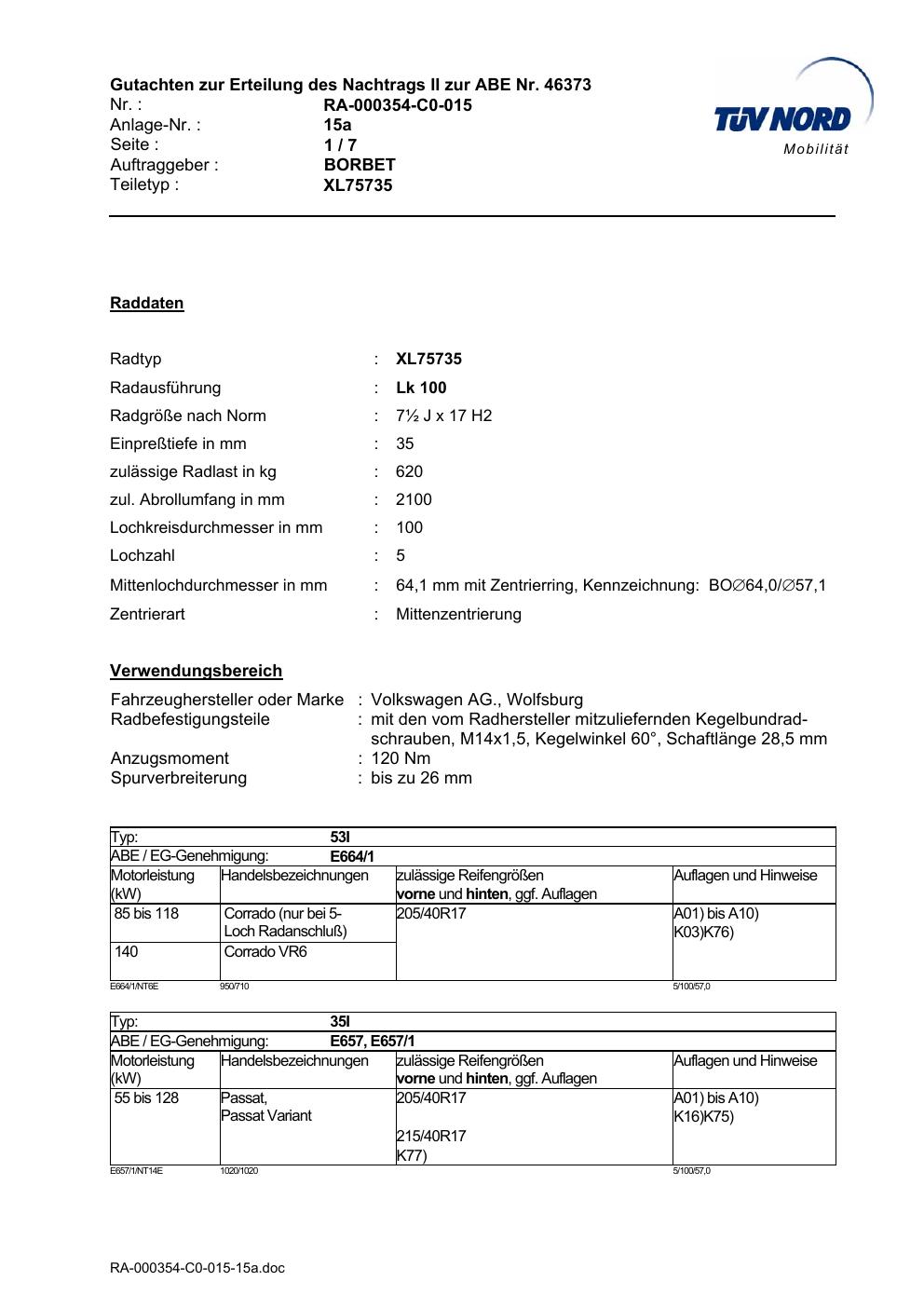 Dieses Gutachten (abe) bezieht sich auf die Alufelge Borbet XL75735 in der Ausführung ET 0, Mittenloch 0 mm (KBA 46373). Im PDF findest du typischerweise zulässige Reifengrößen, Auflagen/Anbauhinweise und – je nach Dokument – Hinweise zur Eintragung.