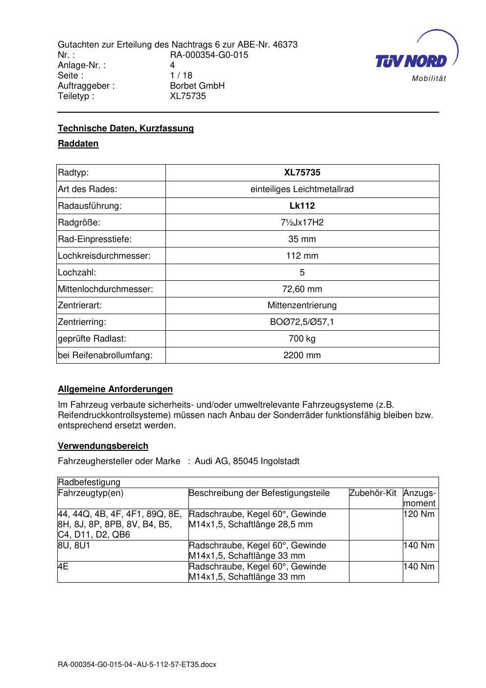 Dieses Gutachten (abe) bezieht sich auf die Alufelge brand-borbet XL75735 in der Ausführung ET 0, Mittenloch 0 mm (KBA 46373). Im PDF findest du typischerweise zulässige Reifengrößen, Auflagen/Anbauhinweise und – je nach Dokument – Hinweise zur Eintragung.