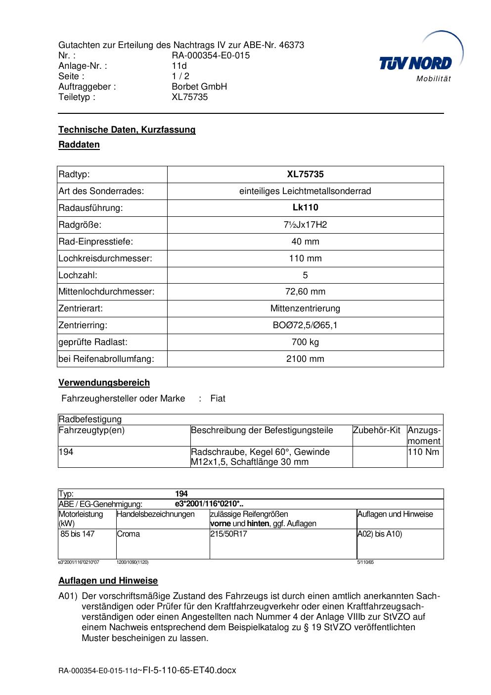 Dieses Gutachten (abe) bezieht sich auf die Alufelge brand-borbet XL75735 in der Ausführung ET 0, Mittenloch 0 mm (KBA 46373). Im PDF findest du typischerweise zulässige Reifengrößen, Auflagen/Anbauhinweise und – je nach Dokument – Hinweise zur Eintragung.