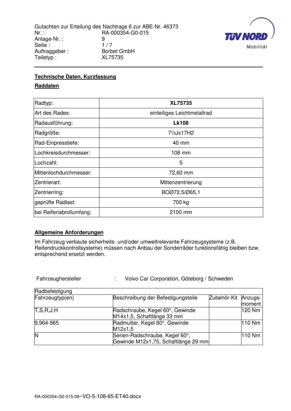 Dieses Gutachten (abe) bezieht sich auf die Alufelge brand-borbet XL75735 in der Ausführung ET 0, Mittenloch 0 mm (KBA 46373). Im PDF findest du typischerweise zulässige Reifengrößen, Auflagen/Anbauhinweise und – je nach Dokument – Hinweise zur Eintragung.