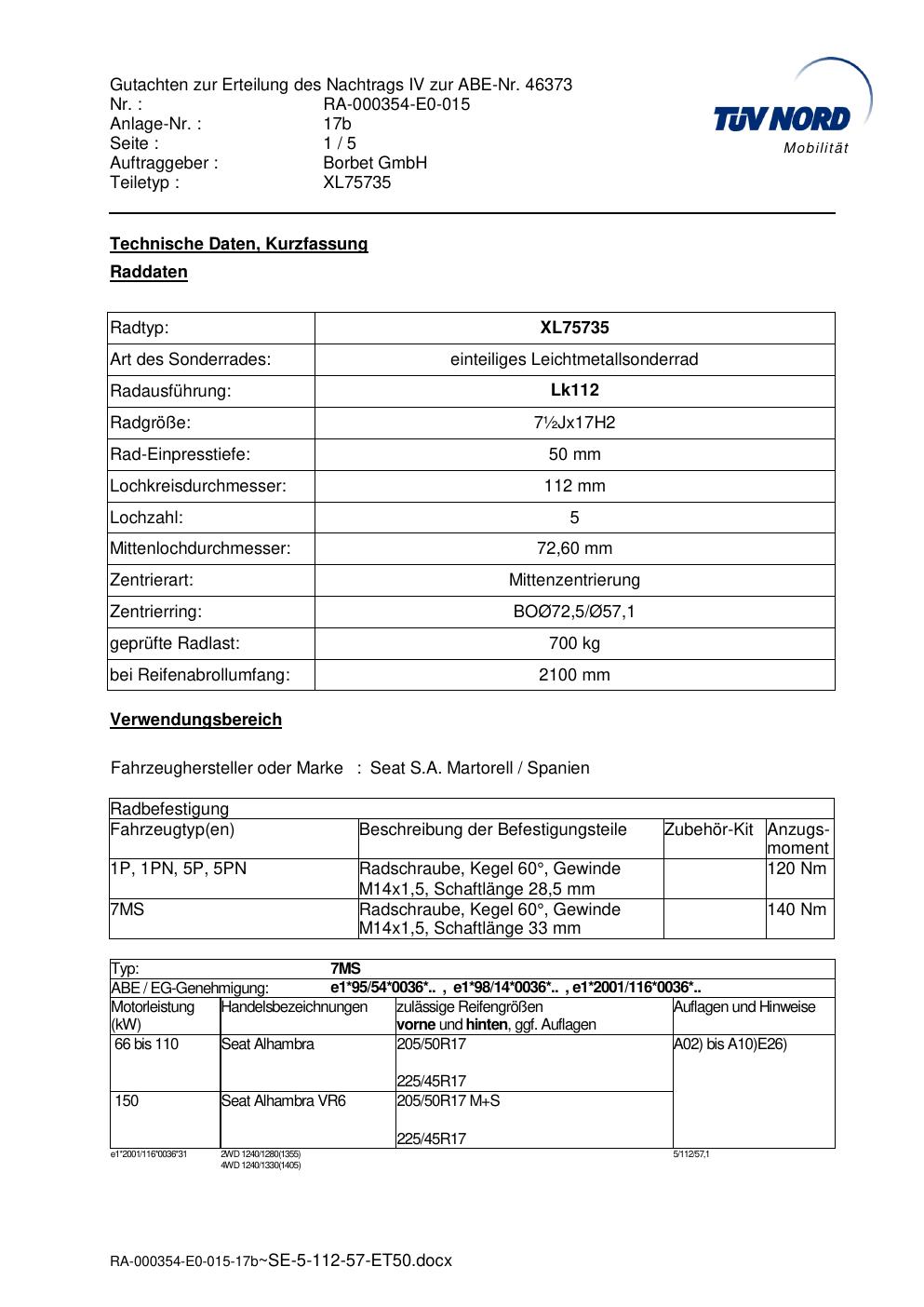 Dieses Gutachten (abe) bezieht sich auf die Alufelge brand-borbet XL75735 in der Ausführung ET 0, Mittenloch 0 mm (KBA 46373). Im PDF findest du typischerweise zulässige Reifengrößen, Auflagen/Anbauhinweise und – je nach Dokument – Hinweise zur Eintragung.