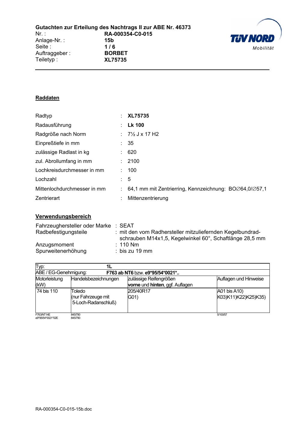 Dieses Gutachten (abe) bezieht sich auf die Alufelge brand-borbet XL75735 in der Ausführung ET 0, Mittenloch 0 mm (KBA 46373). Im PDF findest du typischerweise zulässige Reifengrößen, Auflagen/Anbauhinweise und – je nach Dokument – Hinweise zur Eintragung.
