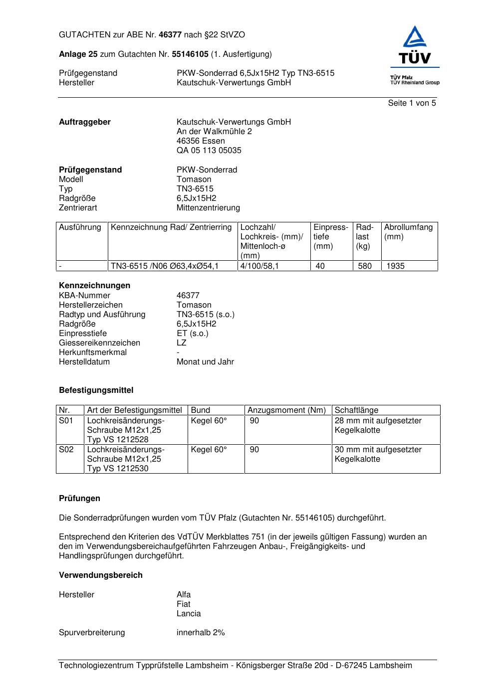Felgengutachten / abe für Alufelgen ATS TN3-6515 (6.5Jx15 ET 0, Mittenloch 0 mm) mit KBA 46377 (Zertifikatsnummer 46377). Hier kostenlos als PDF herunterladen. Der Download-Link ist 24 Stunden gültig und kann bis zu zwei Mal verwendet werden.