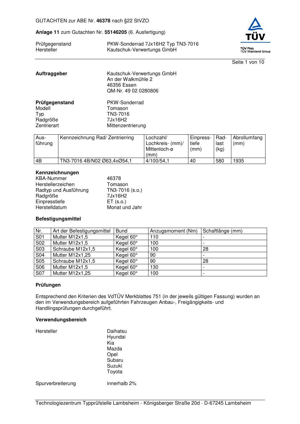 Dieses Gutachten (abe) bezieht sich auf die Alufelge ATS TN3-7016 in der Ausführung 7Jx16 ET 0, Mittenloch 0 mm (KBA 46378). Im PDF findest du typischerweise zulässige Reifengrößen, Auflagen/Anbauhinweise und – je nach Dokument – Hinweise zur Eintragung.