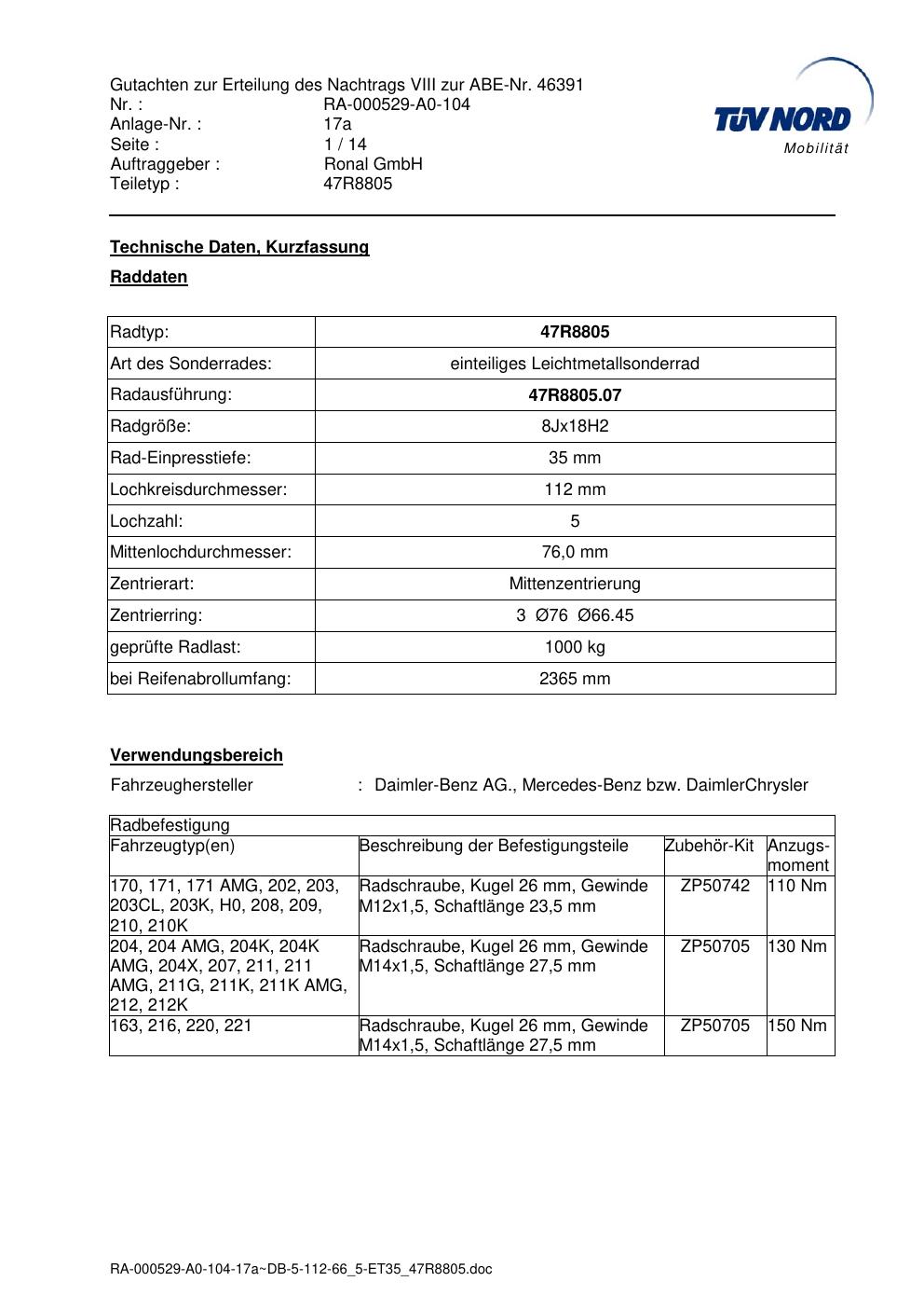 Dieses Gutachten (abe) bezieht sich auf die Alufelge brand-ronal 47R8805 in der Ausführung 8Jx18 ET 0, Mittenloch 0 mm (KBA 46391). Im PDF findest du typischerweise zulässige Reifengrößen, Auflagen/Anbauhinweise und – je nach Dokument – Hinweise zur Eintragung.