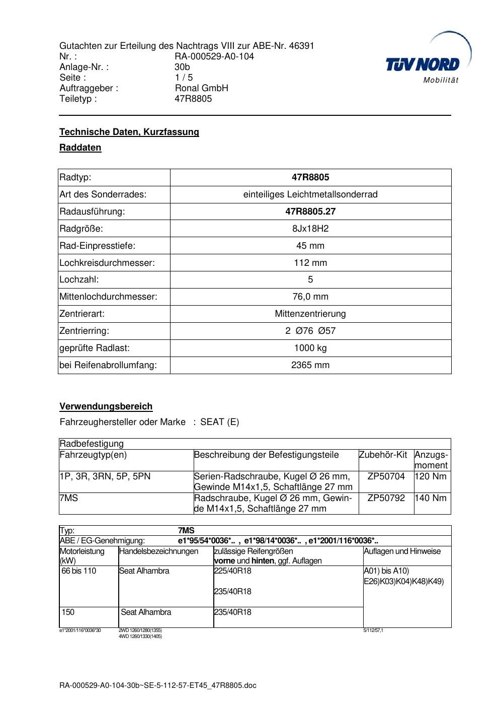Dieses Gutachten (abe) bezieht sich auf die Alufelge brand-ronal 47R8805 in der Ausführung 8Jx18 ET 0, Mittenloch 0 mm (KBA 46391). Im PDF findest du typischerweise zulässige Reifengrößen, Auflagen/Anbauhinweise und – je nach Dokument – Hinweise zur Eintragung.