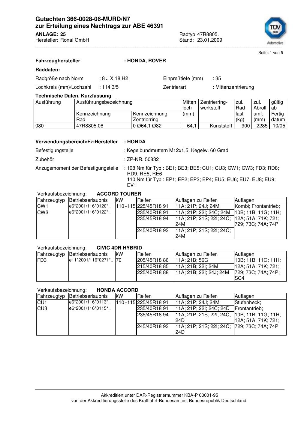 Dieses Gutachten (abe) bezieht sich auf die Alufelge Ronal 47R8805 in der Ausführung 8Jx18 ET 0, Mittenloch 0 mm (KBA 46391). Im PDF findest du typischerweise zulässige Reifengrößen, Auflagen/Anbauhinweise und – je nach Dokument – Hinweise zur Eintragung.