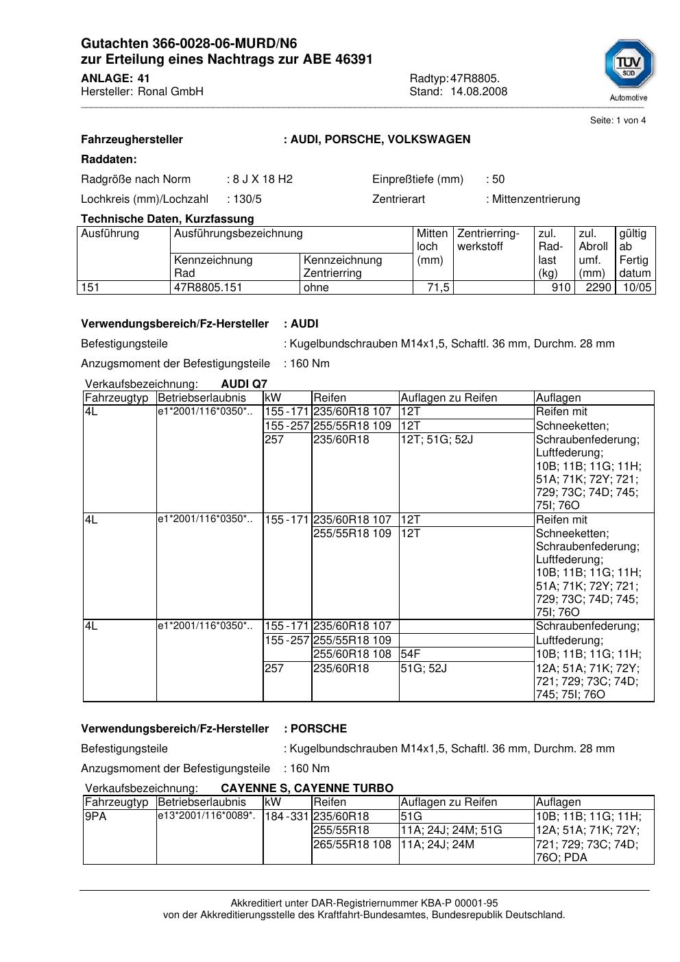 Dieses Gutachten (abe) bezieht sich auf die Alufelge brand-ronal 47R8805 in der Ausführung 8Jx18 ET 0, Mittenloch 0 mm (KBA 46391). Im PDF findest du typischerweise zulässige Reifengrößen, Auflagen/Anbauhinweise und – je nach Dokument – Hinweise zur Eintragung.