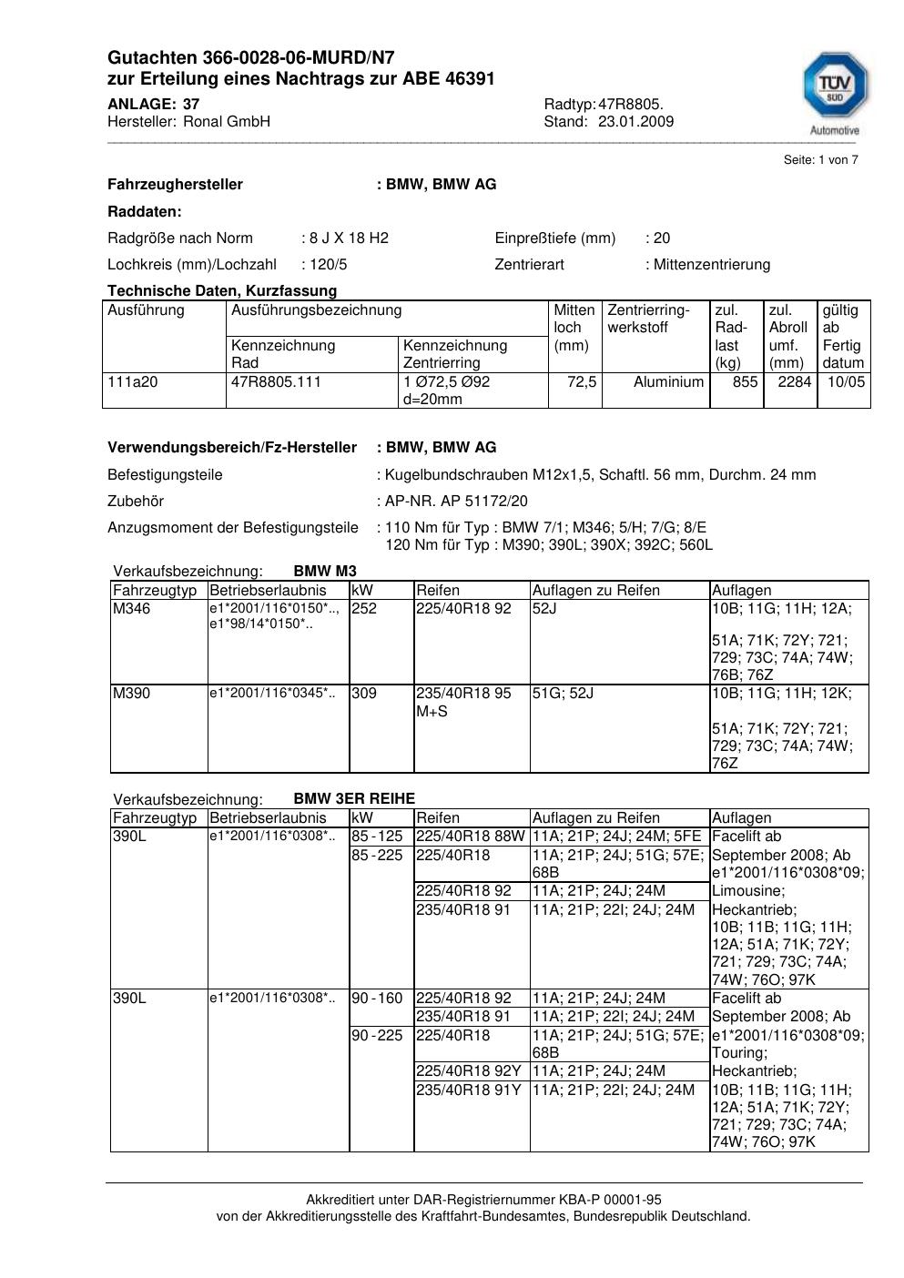 Dieses Gutachten (abe) bezieht sich auf die Alufelge brand-ronal 47R8805 in der Ausführung 8Jx18 ET 0, Mittenloch 0 mm (KBA 46391). Im PDF findest du typischerweise zulässige Reifengrößen, Auflagen/Anbauhinweise und – je nach Dokument – Hinweise zur Eintragung.